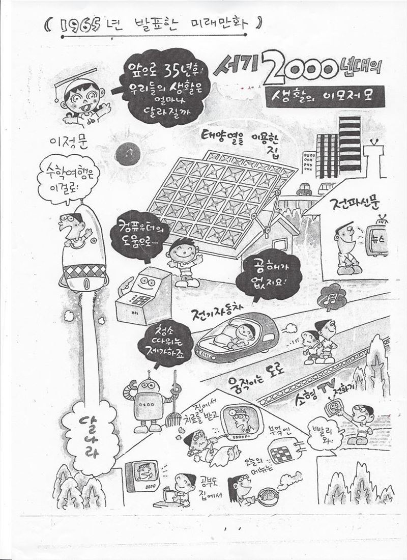 그런데 당시 상상했던 우리의 삶은 거의 대부분 현실이 됐다. 태양열을 이용한 집, 전기자동차, 전파신문(현 웹진), 소형TV 전화기, 화상을 통한 교육, 원격진료, 무빙워크, 로봇청소기 등등이 당시 이정문 화백이 바라본 미래의 우리 삶이다. 단 하나 수학여행을 달나라고 간다는 상상은 여전히 풀어야 할 과제다.